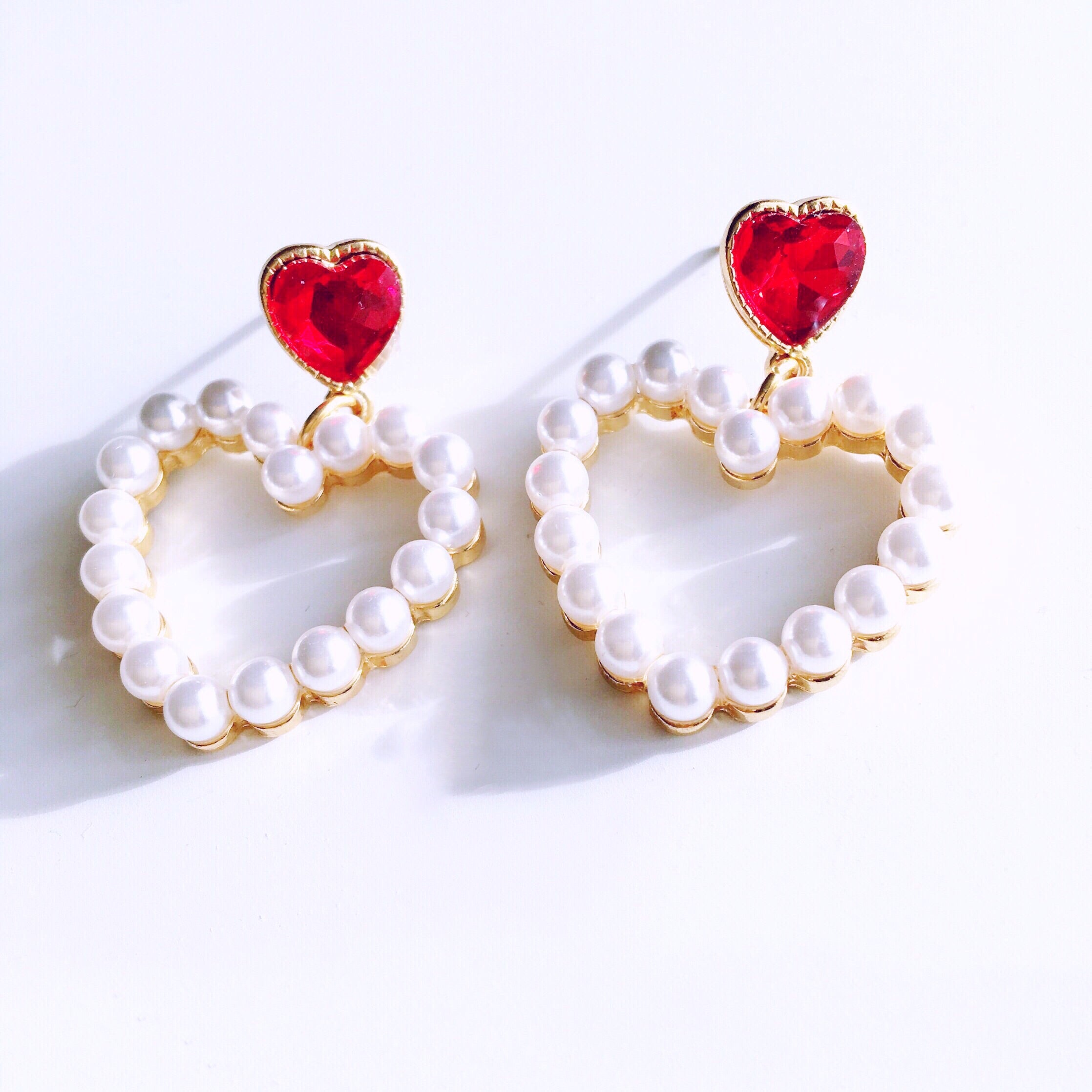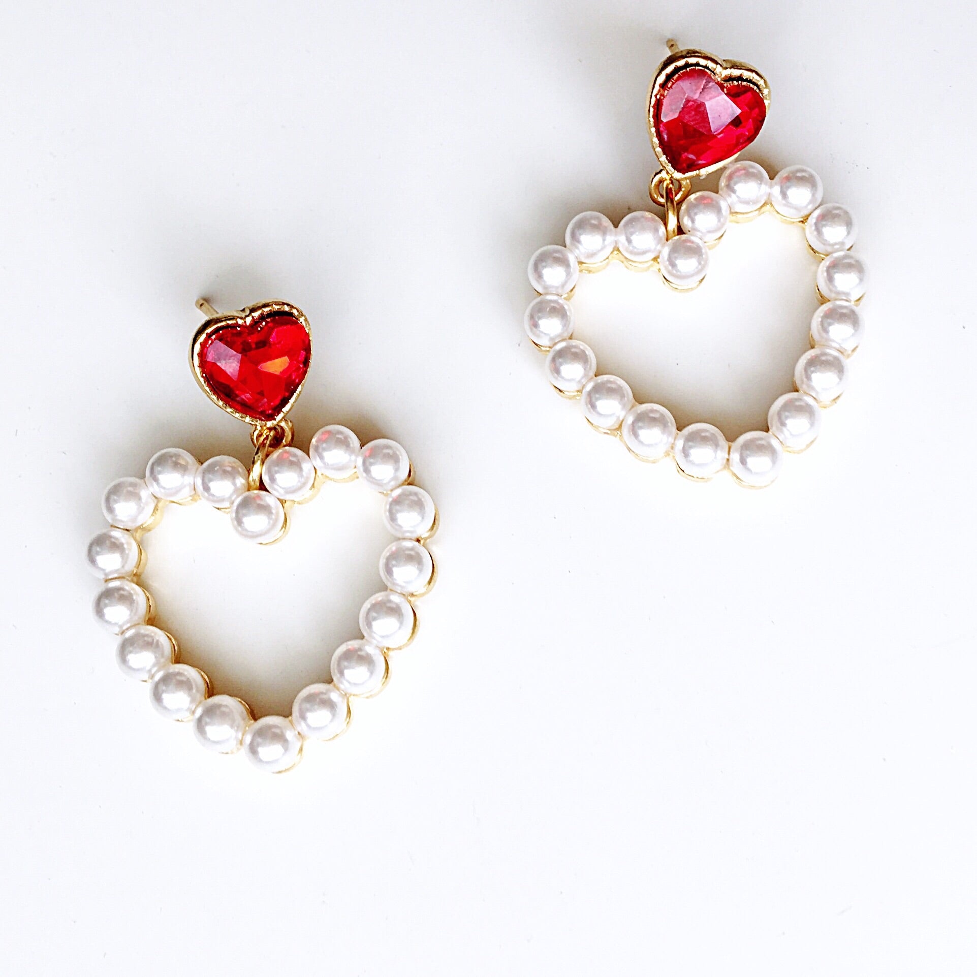 RED DIAMANTÉ FAUX PEARL HEART EARRINGS