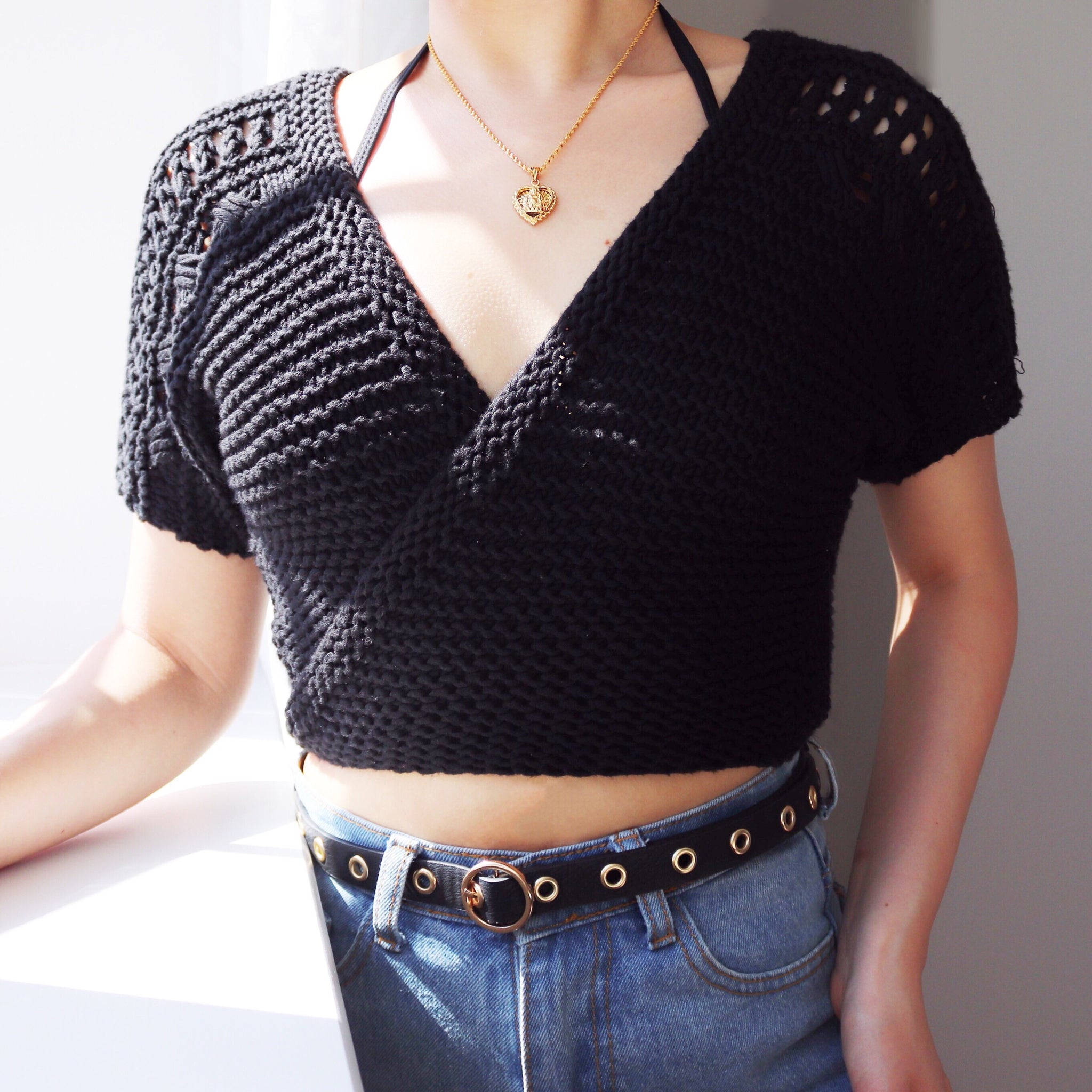 THICK YARN KNIT SHORT SLEEVES WRAP TOP